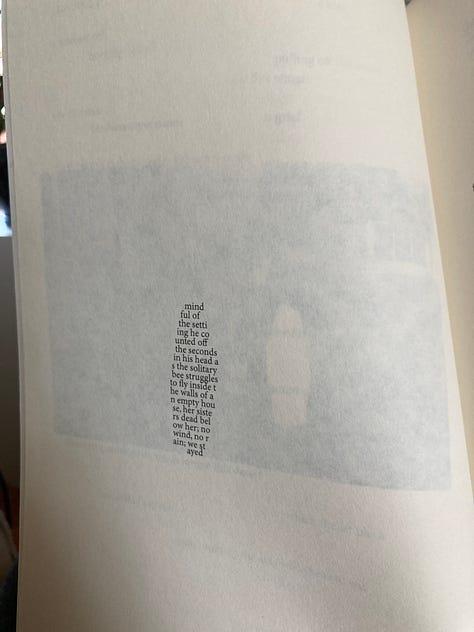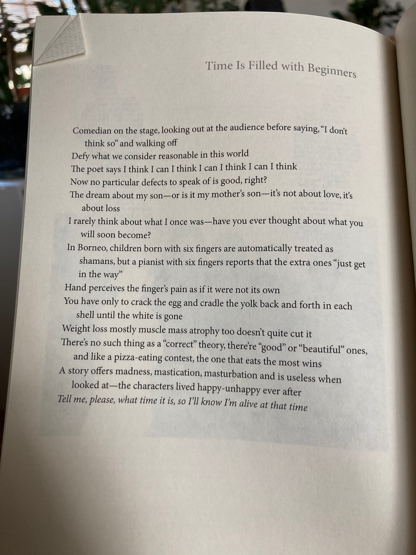 And I can’t end there—as I’m sure the visual and formal aspects of Ghost Of often got so much critical attention. But the more traditional poems here also wow me, offering utopian gestures, glimpses, and invitations. One of my favorites is, not surprisingly, obsessed with time: