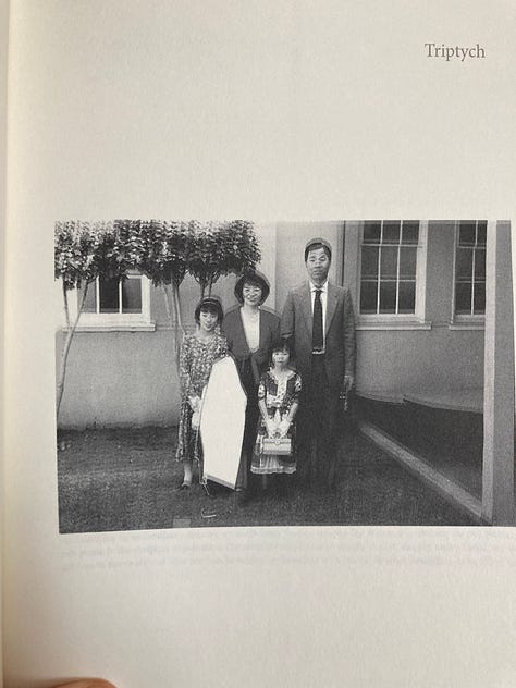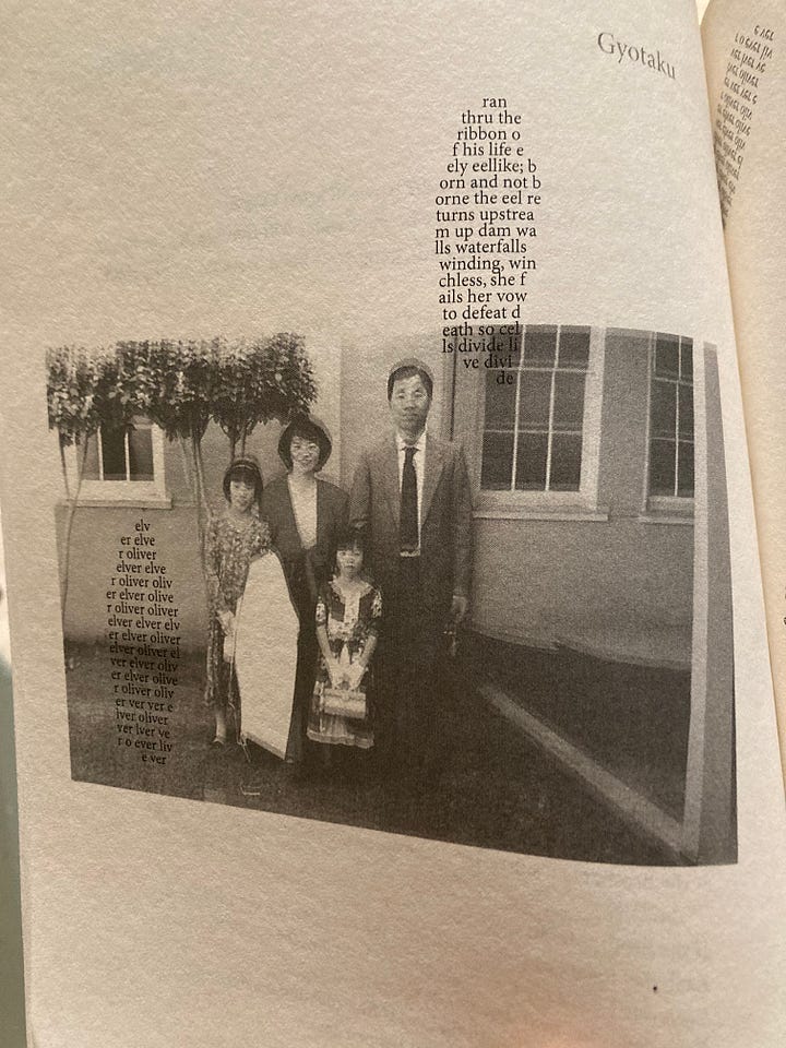 Throughout the collection, Nguyen includes visual poems all titled “Triptych” or “Gyotaku.” The Triptychs each begin with a family photograph that the poet’s brother cut himself out of. What’s missing is literal and extremely pronounced in these photographs. On the next page, text is written in the shape of the missing part of the photograph, the silhouette of the missing person—the entire page is white apart from text written into the form that had been white space in the previous page’s image. Finally, the last part of the triptych is written in a square block of text with white space cutting through the text in the same shape missing from the original photo.