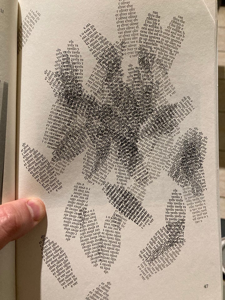 The text in the pattern is exactly repeated from the previous page, but the shapes often overlap in a way that blurs or darkens the text beyond legibility, so I don’t think it’s meant to be read again. The text has instead transformed into something new, something the language may be reaching towards, but that Nguyen is offering as visual. The poem seems to use what it’s constructed out of the absence to reach for a new way of communicating what can’t be said.